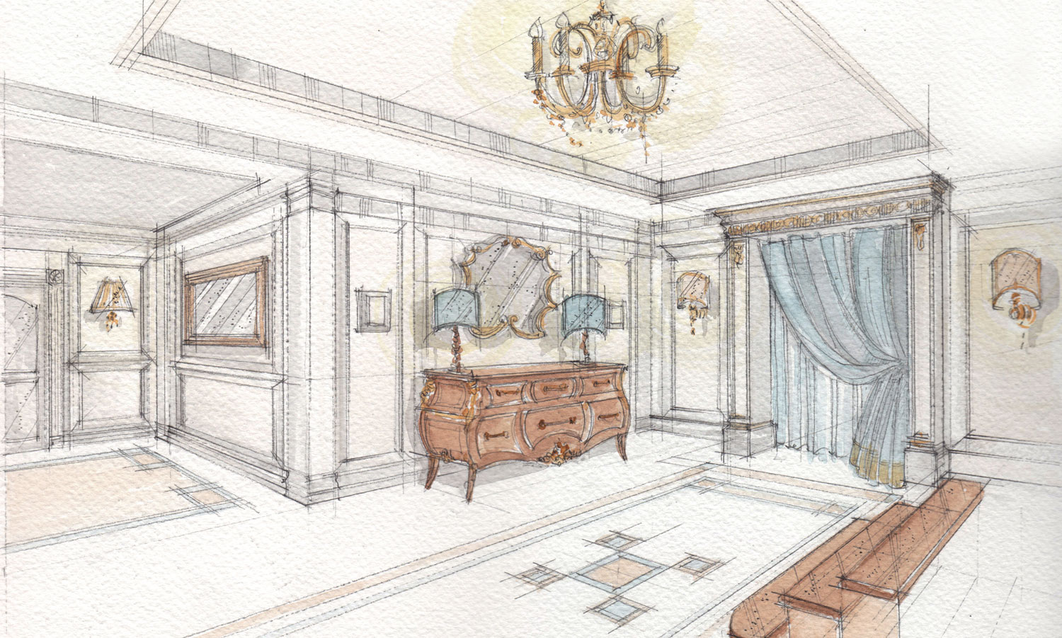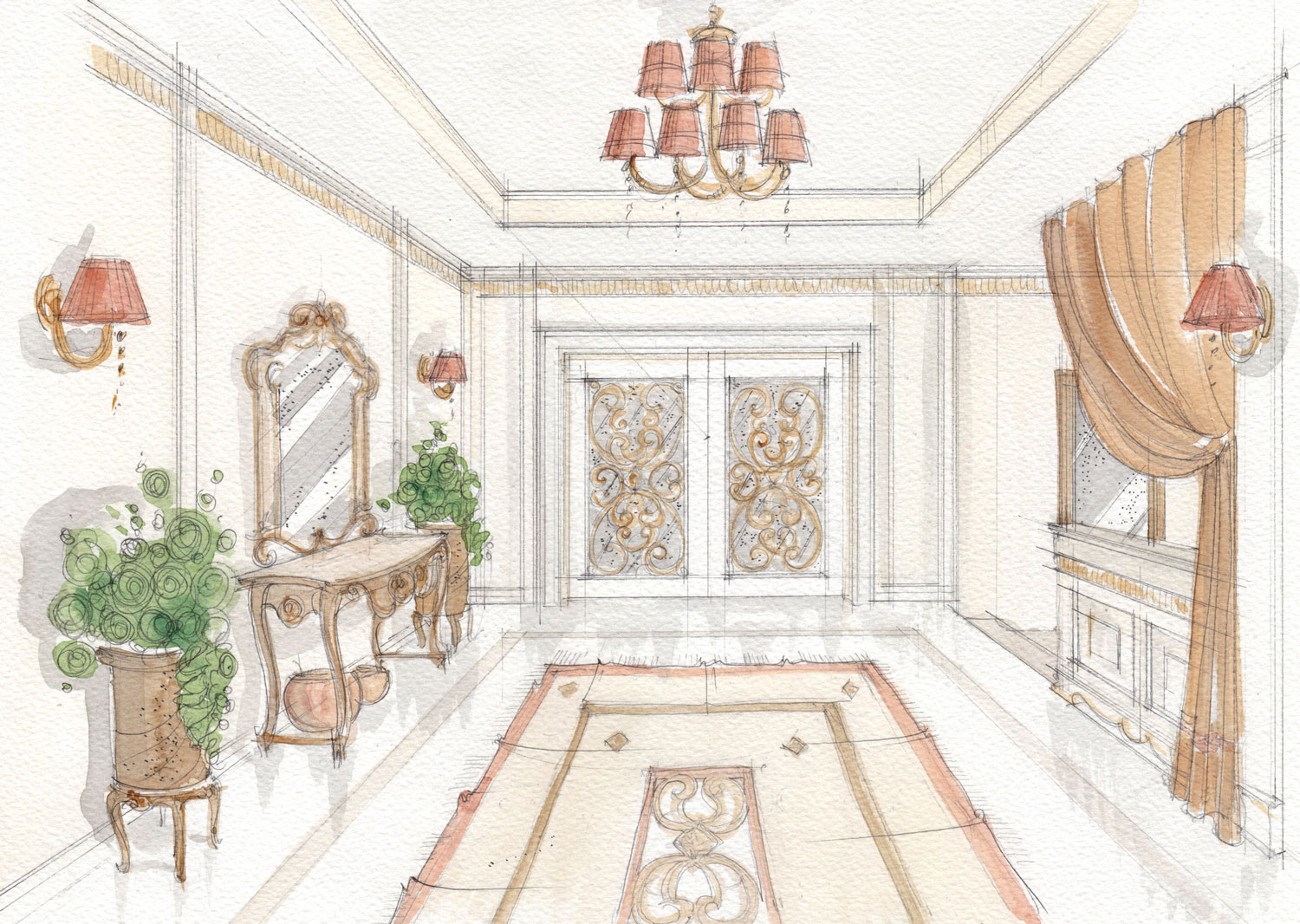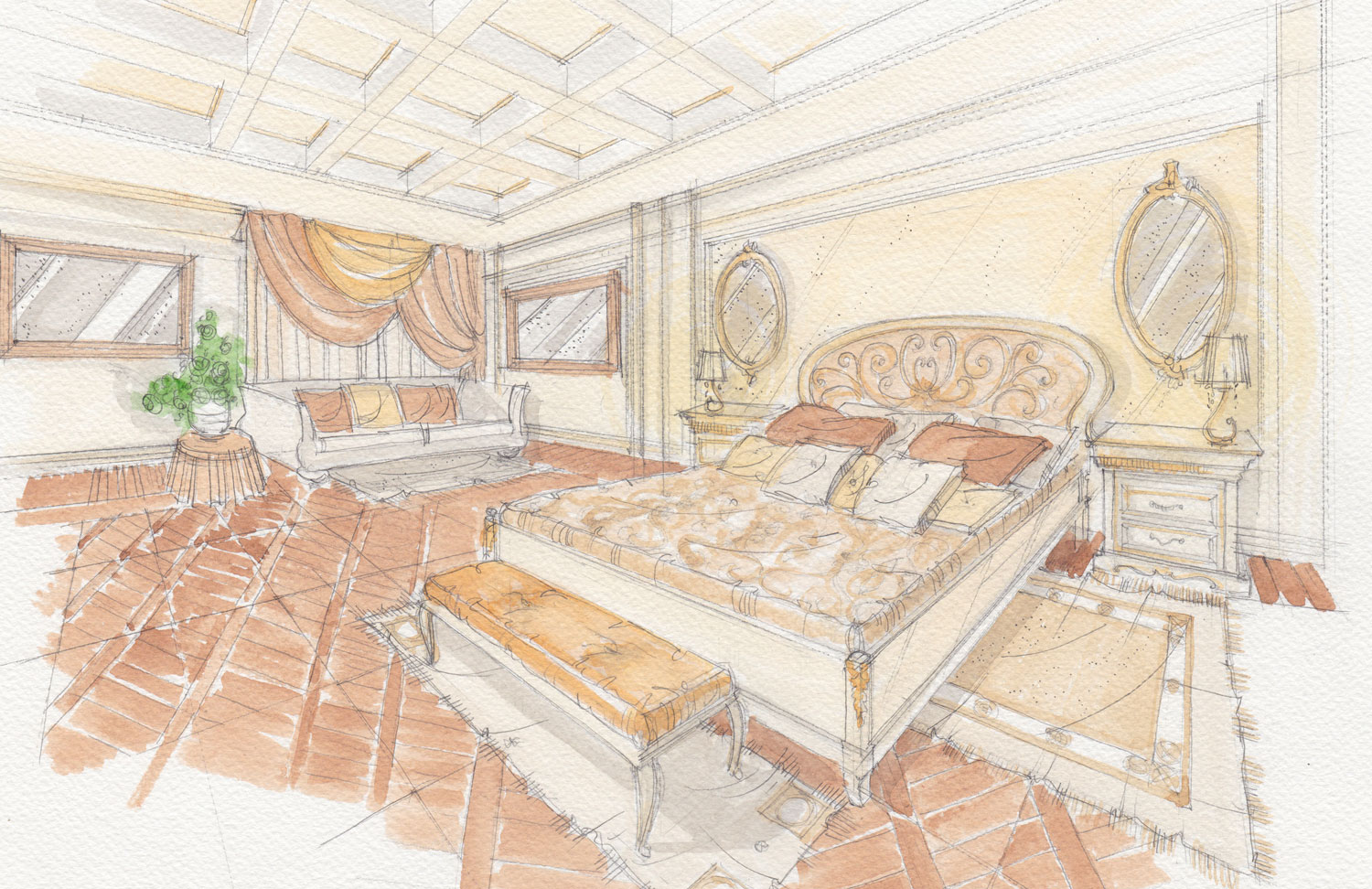 In questo caso le viste sono state sviluppate con l'acquerello tradizionale, su richiesta del cliente. La preparazione alla stesura delle viste finali in acquerello tradizionale è stata sviluppata tramite elaborazione di schizzi generali a supporto della progettazione.