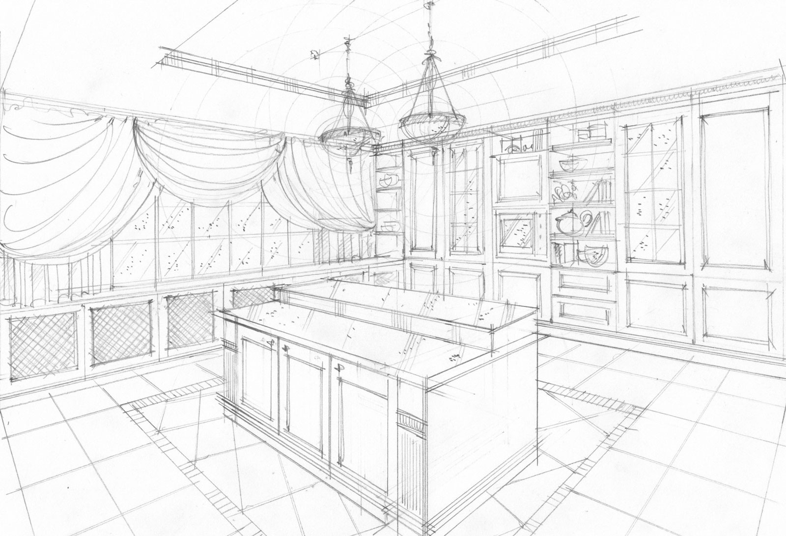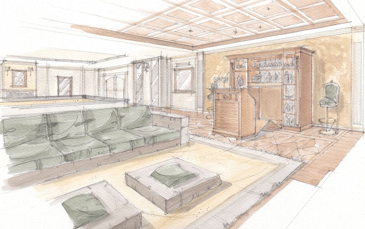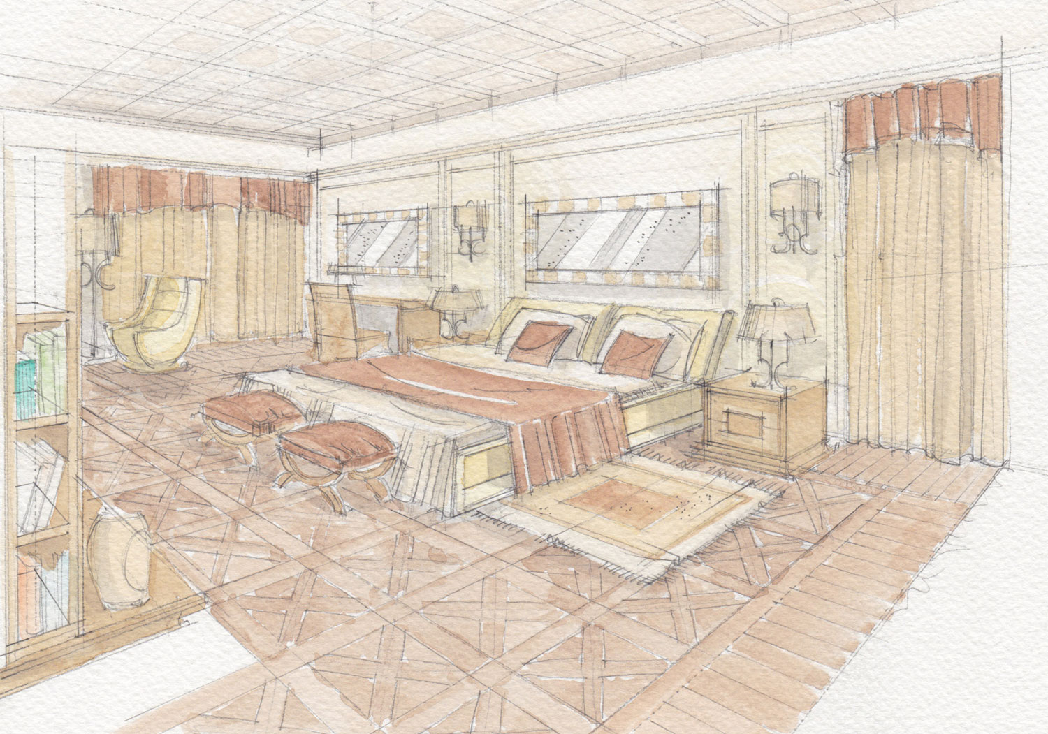 In questo caso le viste sono state sviluppate con l'acquerello tradizionale, su richiesta del cliente. La preparazione alla stesura delle viste finali in acquerello tradizionale è stata sviluppata tramite elaborazione di schizzi generali a supporto della progettazione.