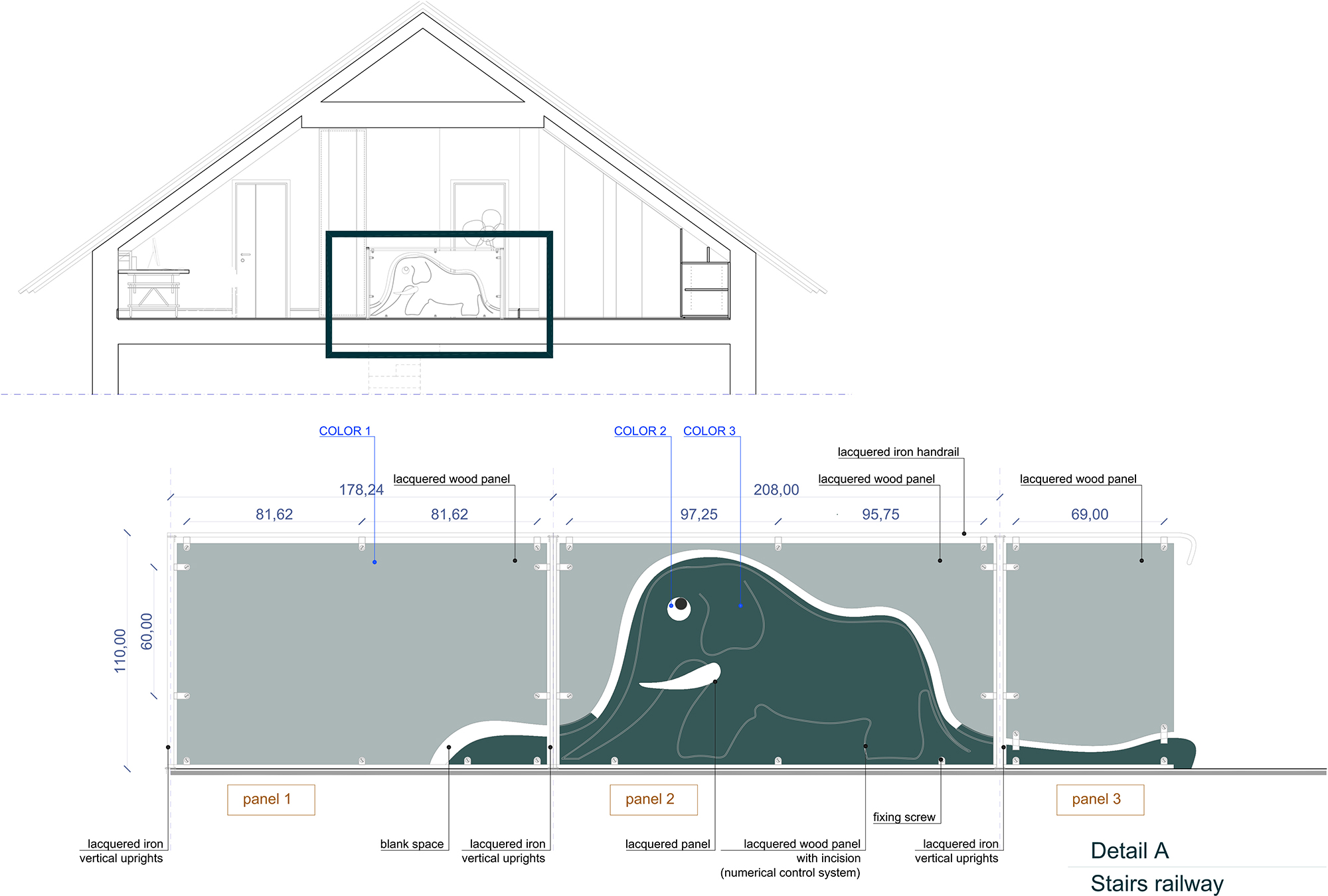 All spaces have natural material and modern colours. The staircase is developed using the “Little Prince” design concept, and shows the famous hat/elephant in the front panel. All panels are made in custom made lacquered MDF and are fixed with steel handrail.
