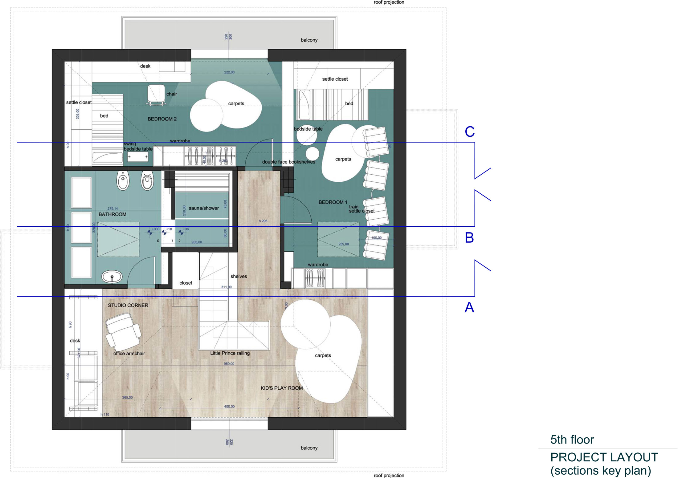 The kids’ area is developed around three requests: a independent room for each child, the opportunity to have a common play room and having a studio corner.