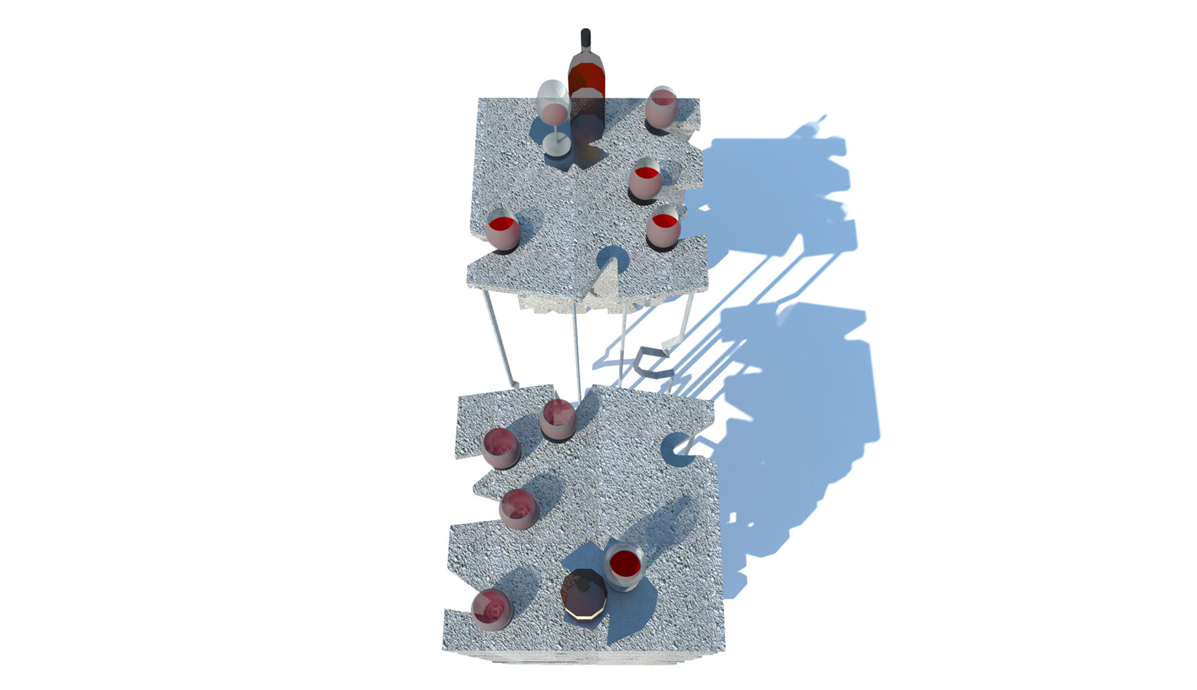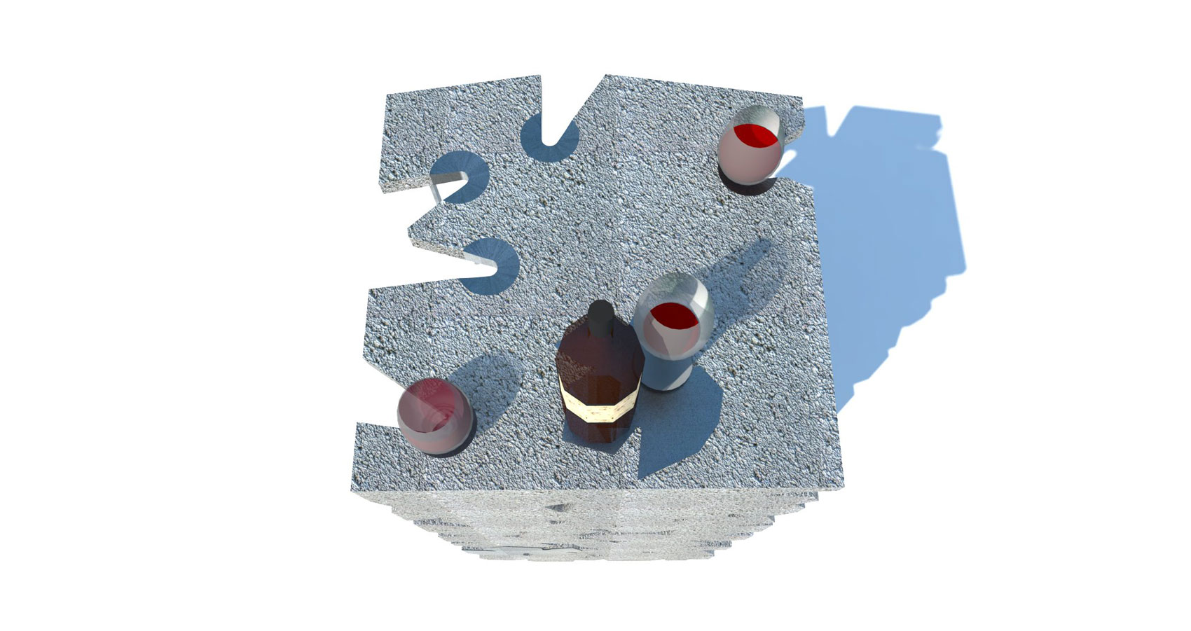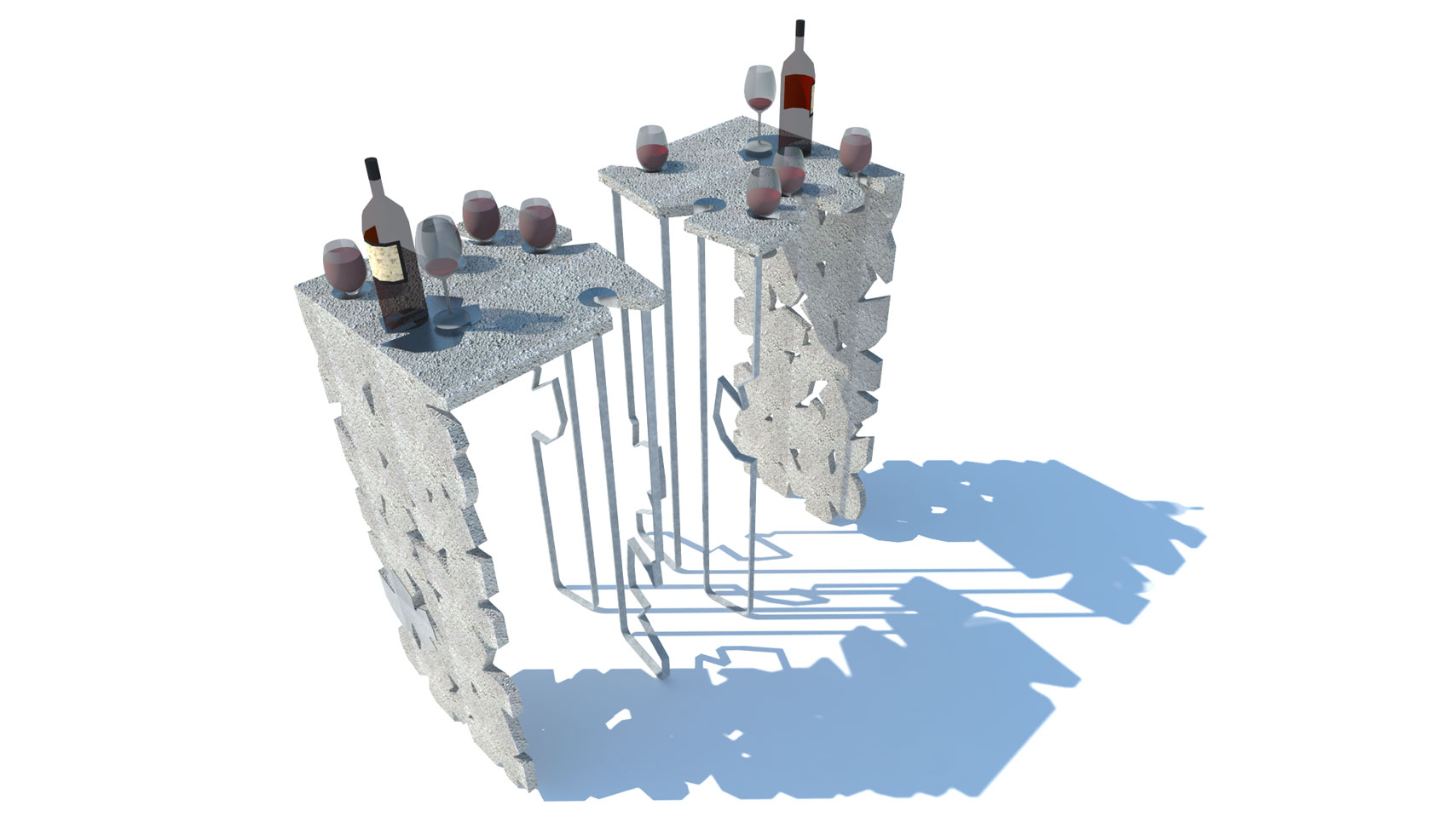 It is born from the geometries of the natural elements from which comes the wine and their reinterpretation in design. The concept is developed by analyzing the relationship between wine in its most primitive form (the vine) and the consumer/taster, synthesized in the formula: