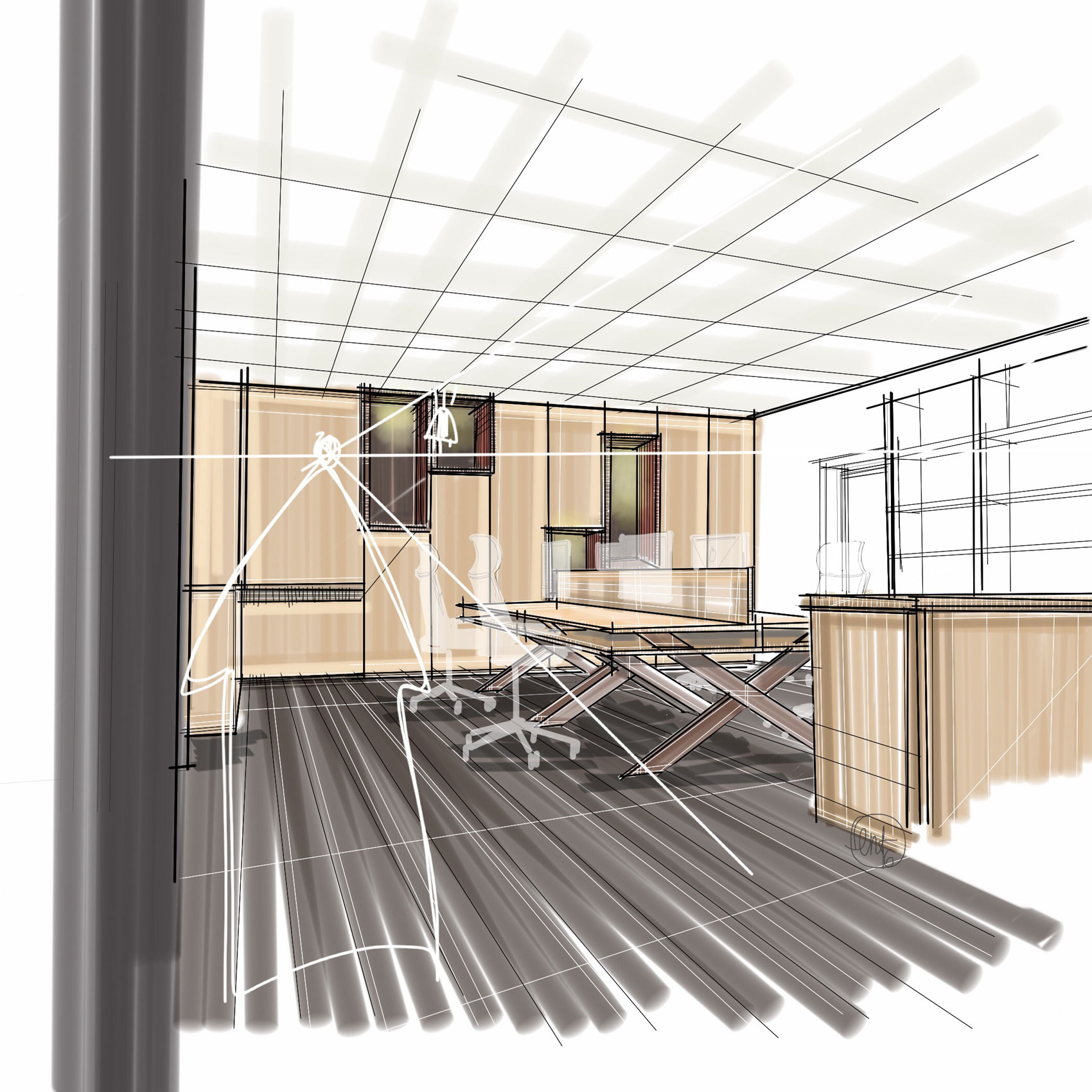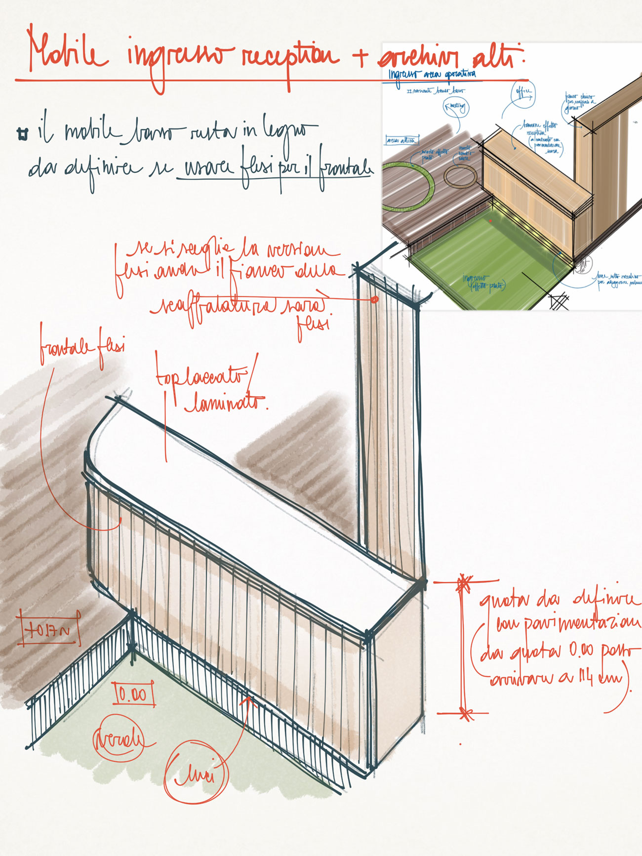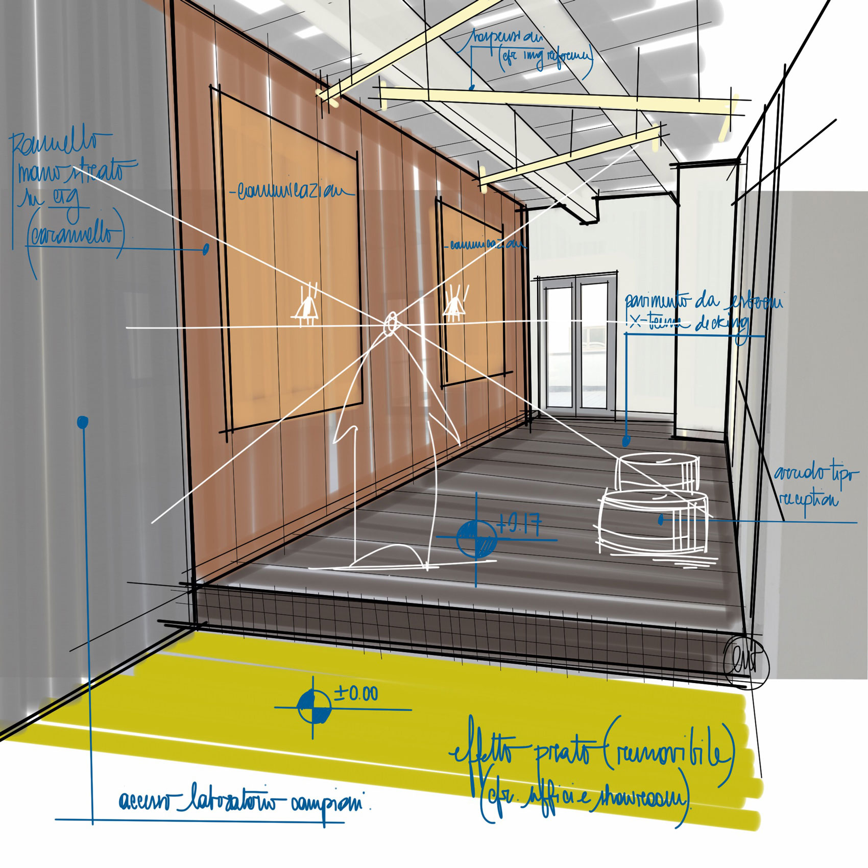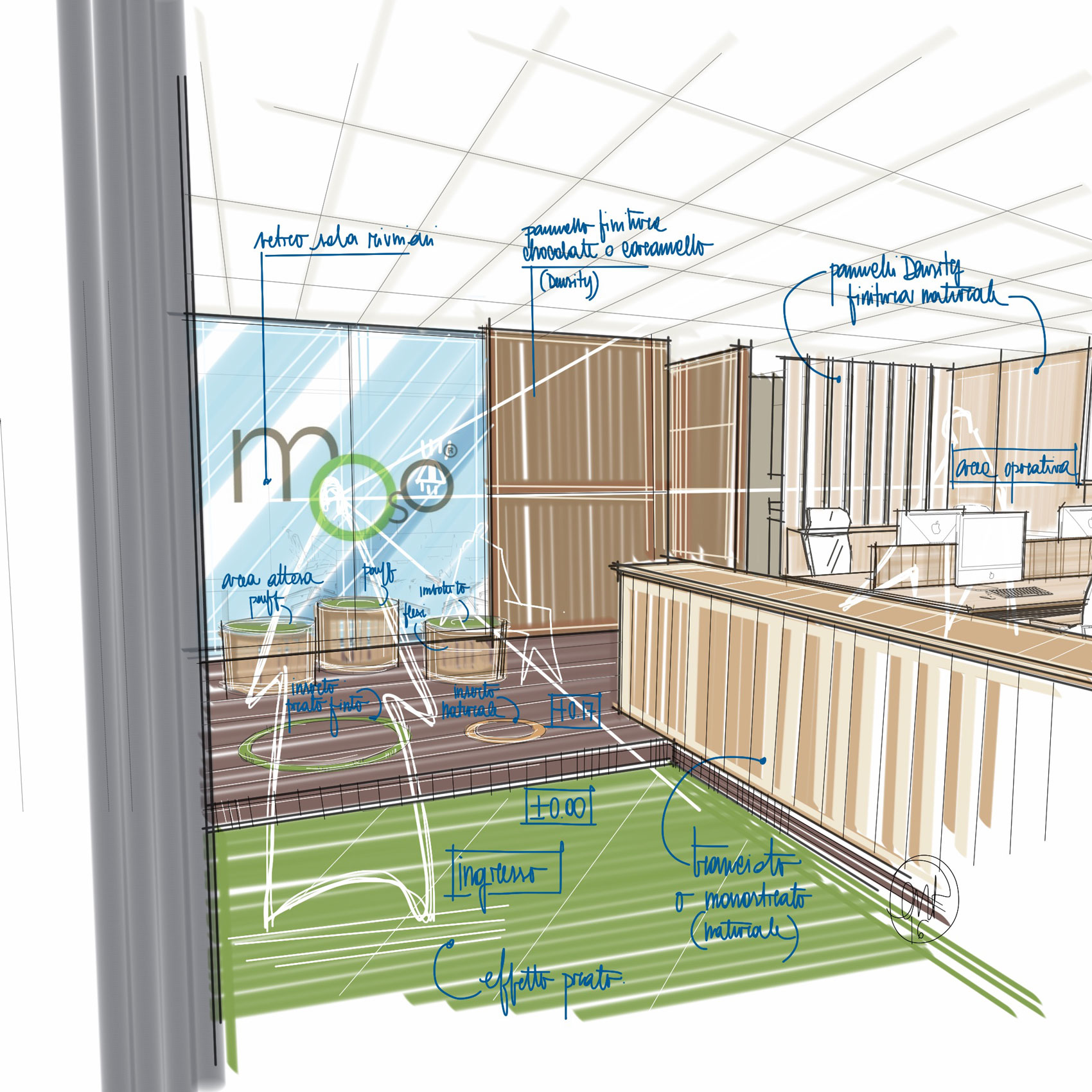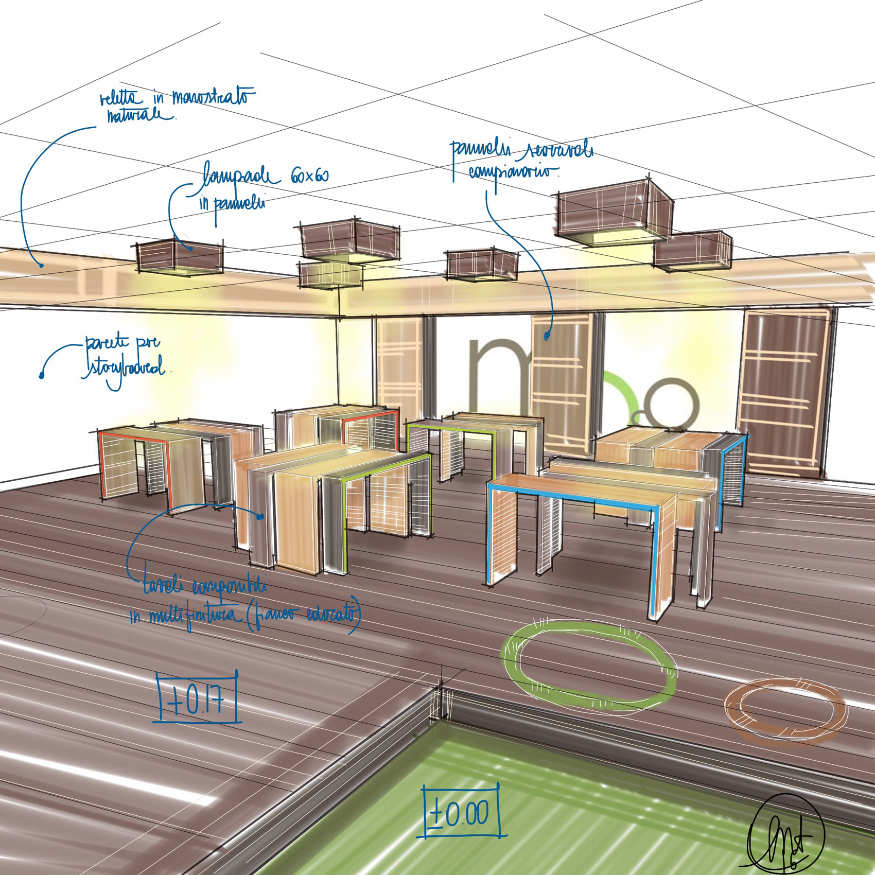 Interior design project for Moso Showroom: Sketches and preliminary render views.