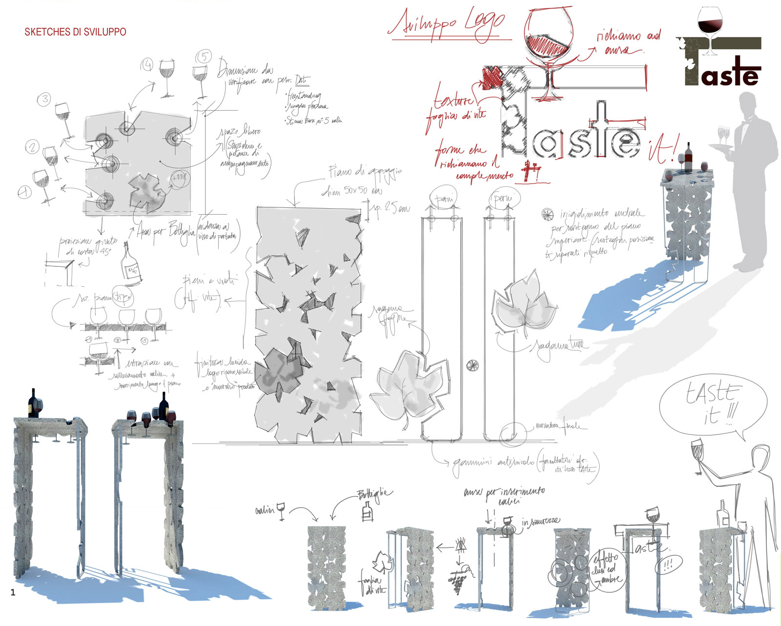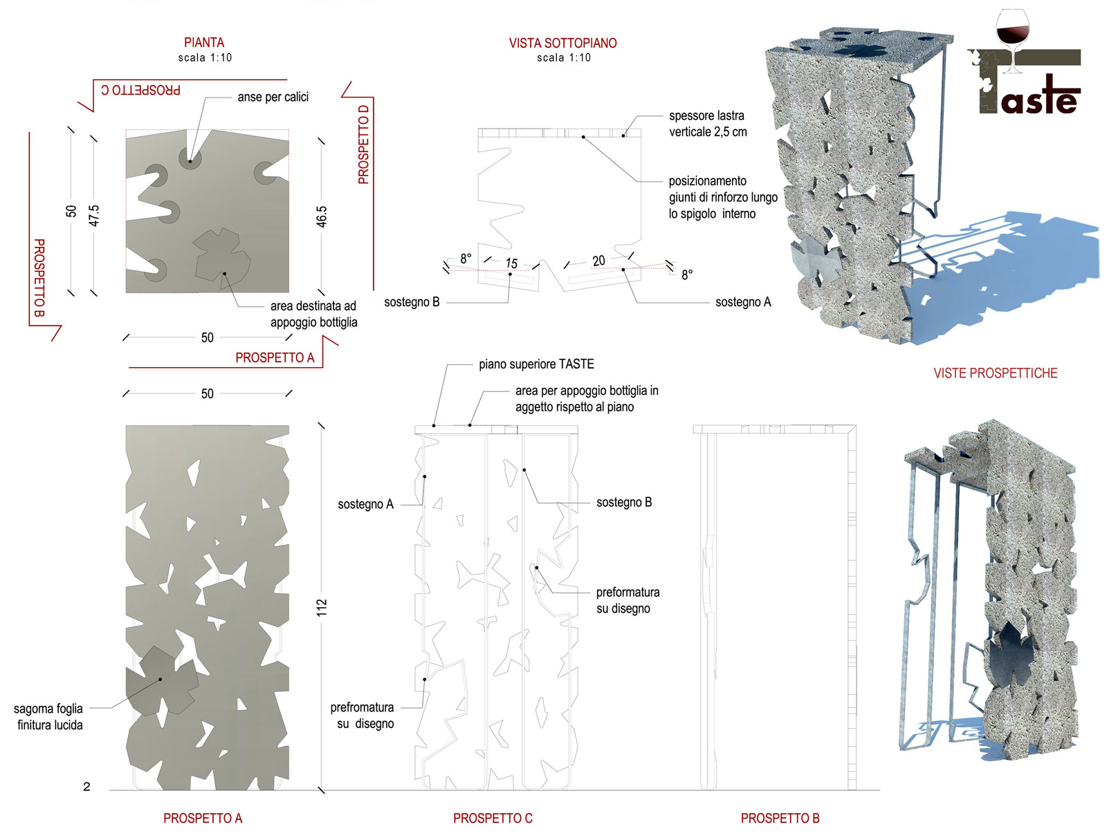 It is born from the geometries of the natural elements from which comes the wine and their reinterpretation in design. The concept is developed by analyzing the relationship between wine in its most primitive form (the vine) and the consumer/taster, synthesized in the formula: